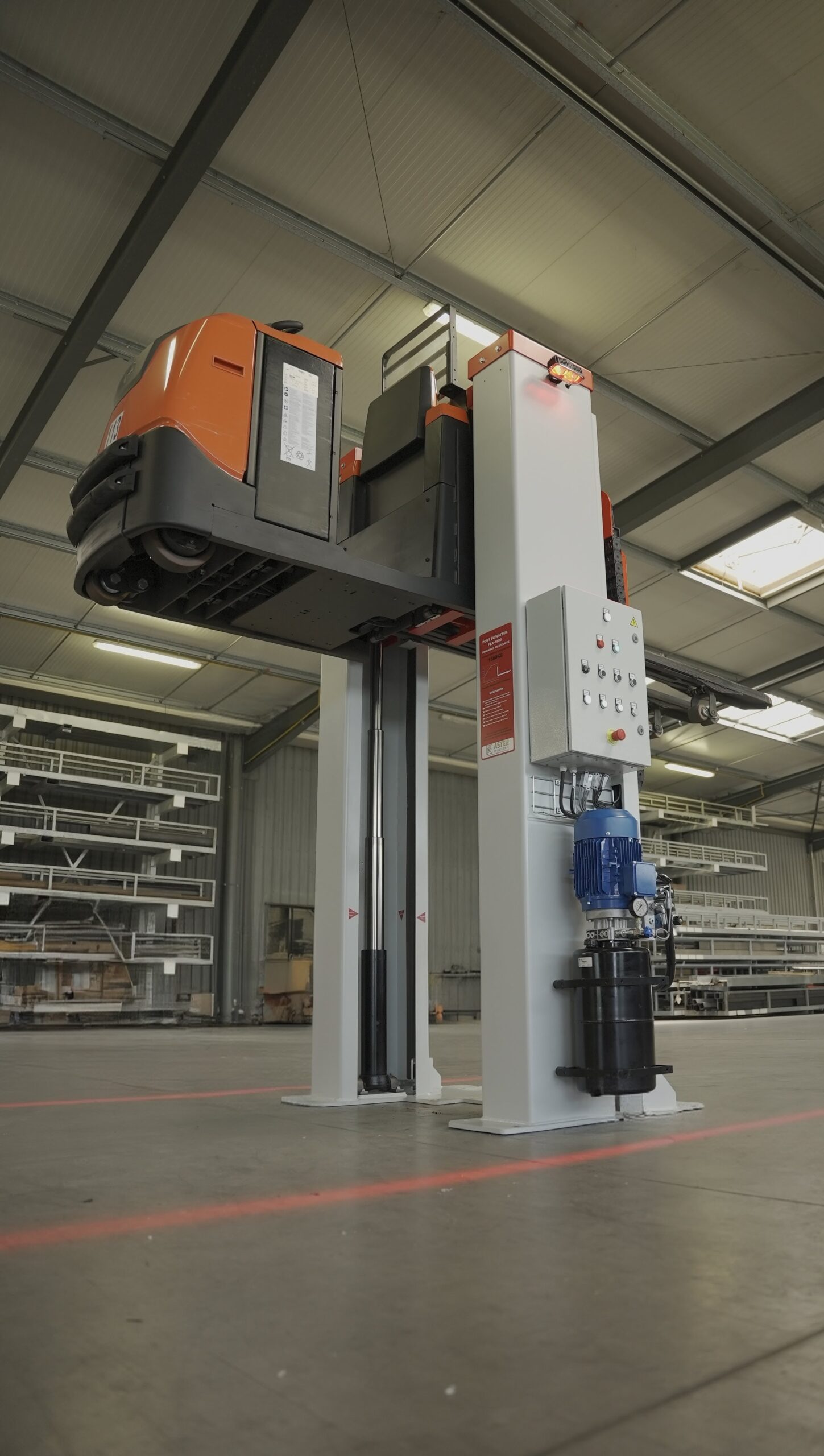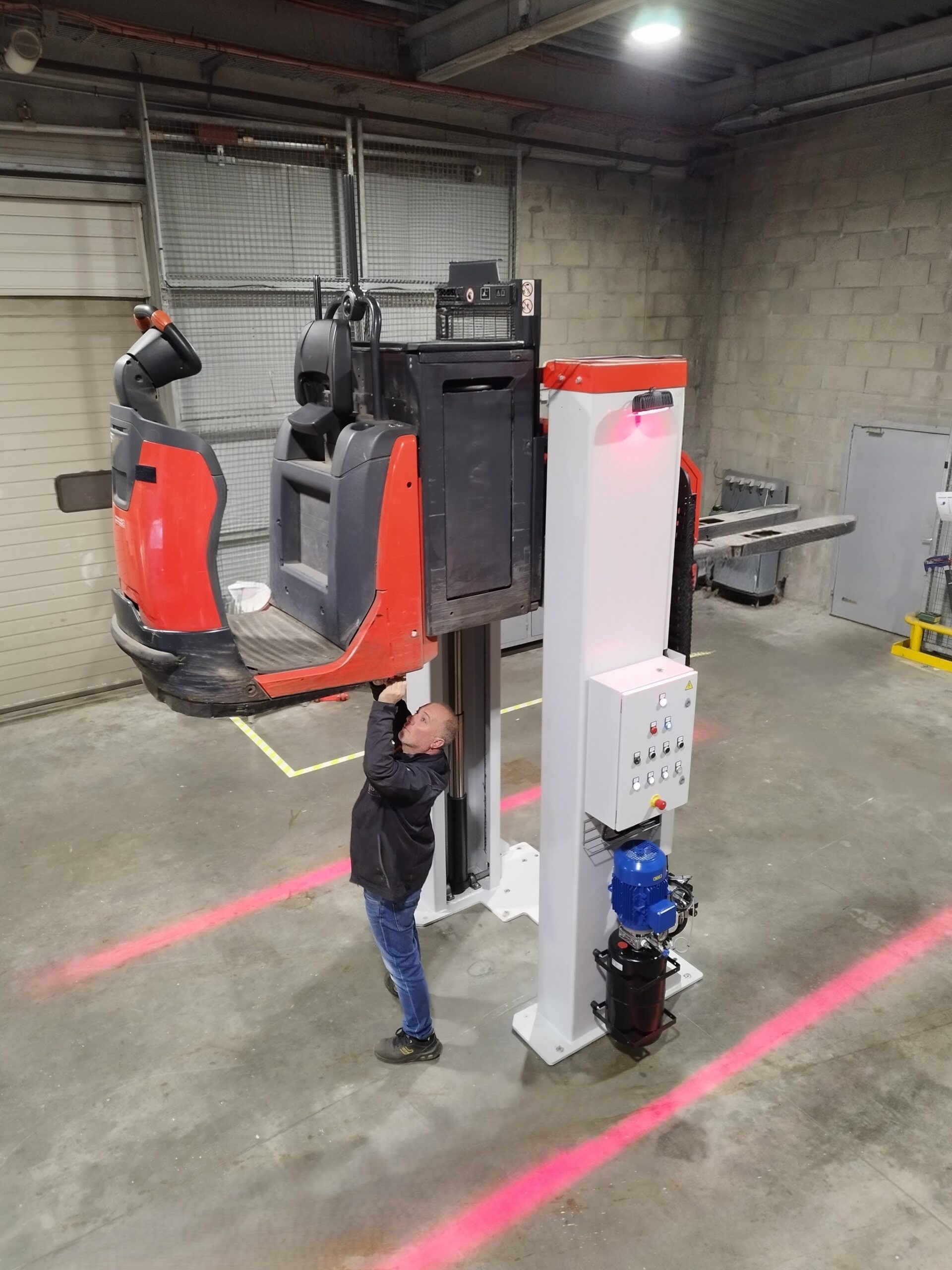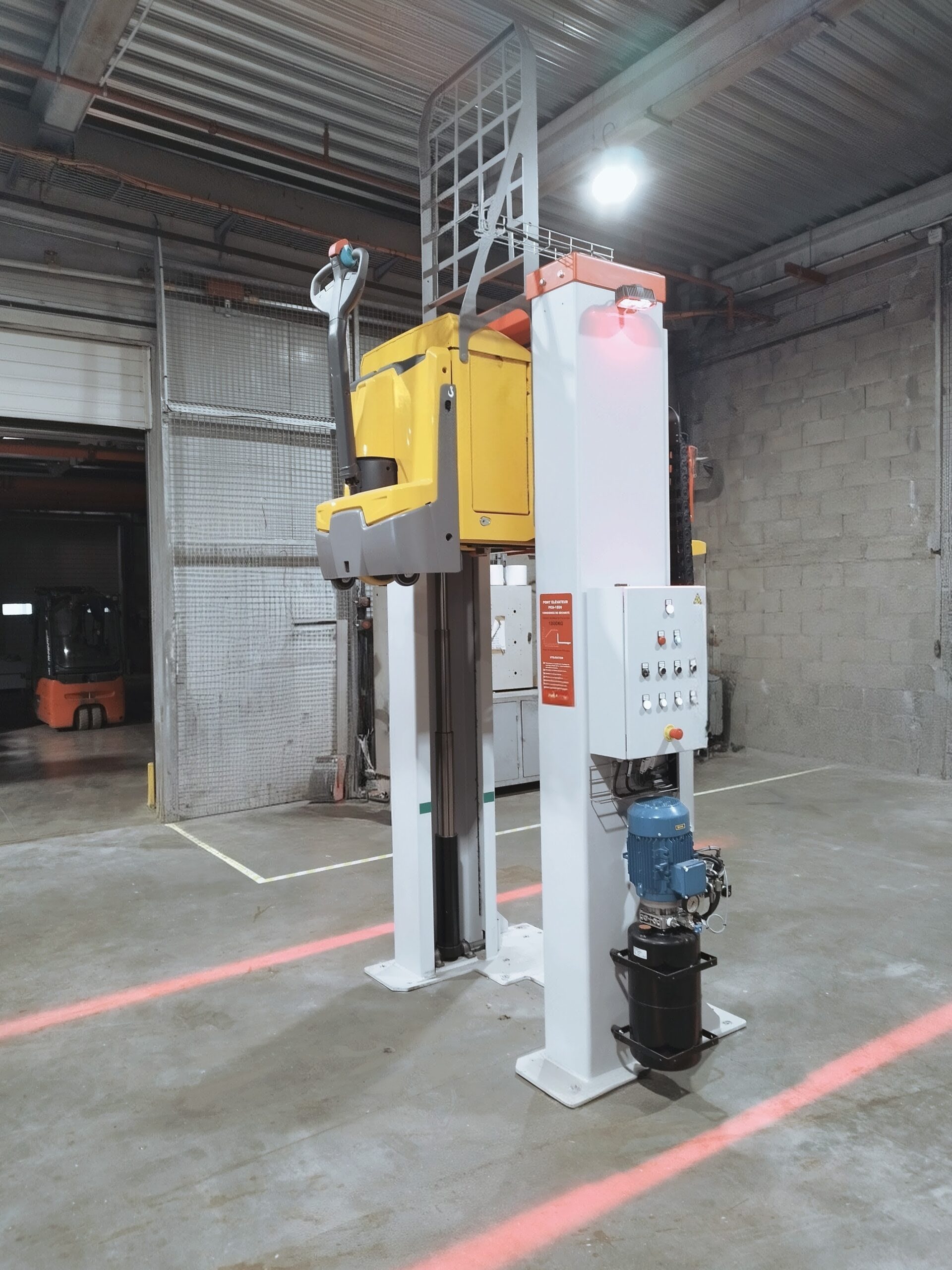 Conçu spécifiquement pour le levage des gerbeurs et transpalettes, le pont élévateur permet un accès rapide et sécurisé aux éléments sous châssis des engins de manutention.